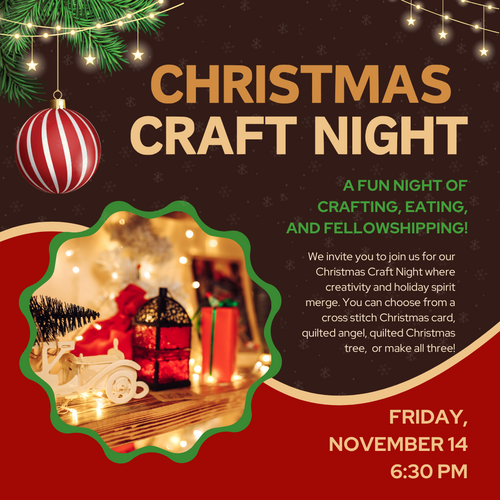 Join us for our Christmas Craft Night where creativity meets Christmas spirit! Click Learn More to see specific crafts being made and sign up.
