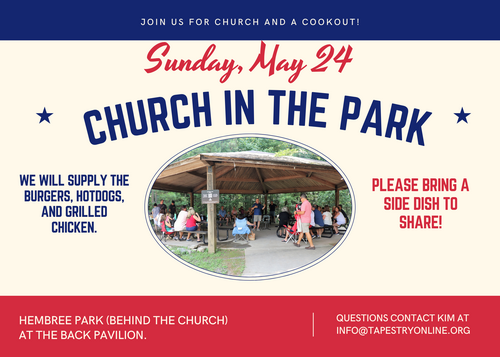 Sunday, May 24 we will meet at Hembree Park at the back pavilion for our regular worship service. Please click the button below to learn more and sign up.