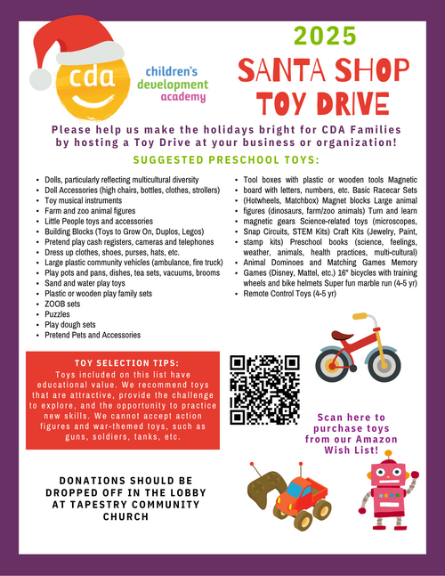 We are once again partnering with Children's Development Academy in Roswell this Christmas by hosting a toy drive. Donations will be collected now through Sunday, December 7. Please bring all donations to the church lobby.
