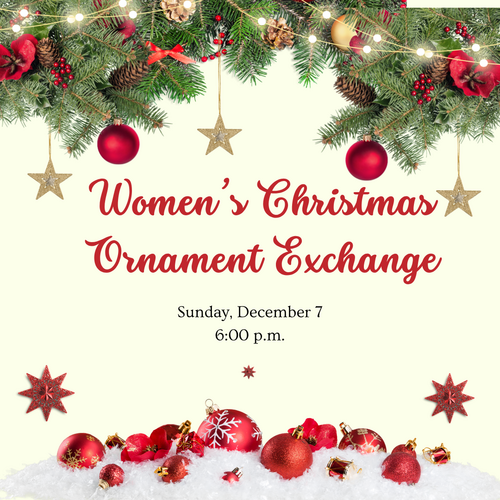 Our most festive women's event is Sunday, December 7 at 6:00 p.m. Join us for an ornament exchange, dinner, and great fun! Click on the button below to register so we know how many to plan for.